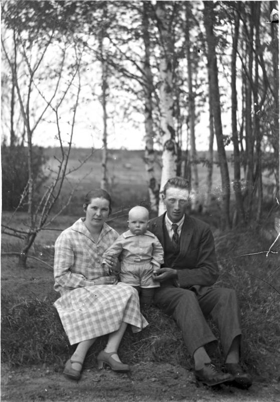 Yrjö ja Aino Herrala istuvat tien vieressä noin vuoden vanhan Riston kanssa. Valokuvaaja Heikki Heikkola