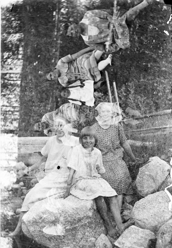 Fanni Korkeamäki, Hilkka Hiipakka ja Elsa Korkeamäki. Toisessa kuvassa näkyy Pennalan sisaruksia ja heidän tätinsä Anna Mäkinen os. Pennala, ylempänä vas Annan tytär Mirjami, pitkälettinen tyttö. Valokuvaaja Heikki Heikkola