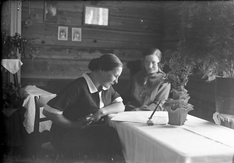 "Hilma (Lyyli) Saarimäki ja Lyydia Katajamäki kirjoittamassa kirjettä kotonaan Töysän Hakojärvellä 1920-luvun keskivaiheilla.