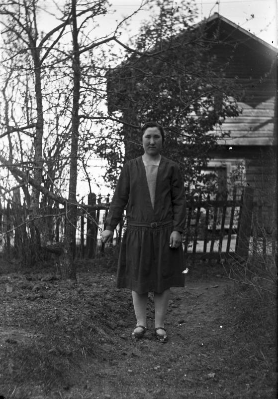Iida Isoaho seisoo, taustalla aita ja luttirakennus