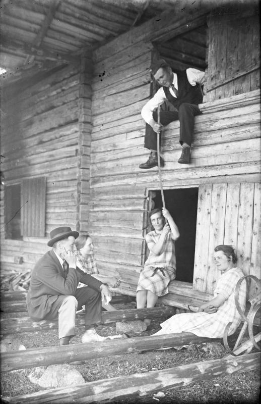 Matti ja Lyyli Saarimäki, kesk. Hilma Ekola, Helmi Saarimäki oik. (Matin vaimo), ylhäällä Erkki Saarimäki, s. 1905. Valokuvaaja Verner Vanhamäki