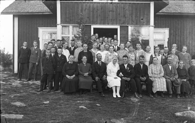 Hääpari Juho Lehtomäki ja Maria Kaunisharju. Hääpäivä 30.8.1930. Sulhasen vieressä Juha ja Sanna-Liisa Kaunisharju. Nestori ja Hilda Kosola, Kaisa ja Heikki Lehtomäki, Elli ja Vihtori Laasasenaho, Vieno, Elmi ja Matti Kaunisharju, Fanni Luoma s. Lehtomäki, Hilma Kilkanen s. Lehtomäki, Taimi, Reino Kosola, Viljo Rantala, Lilja Lampila, Sulo Kaunisharju, Sulo Myllymäki, Elli Heikkilä.