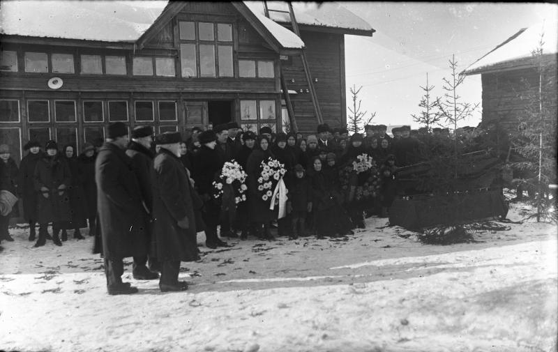 Pastori Frans Kärki, kanttori Mattila, suntio Juho Annala, edustalla mm: Elli Paavola, Jussi Toivola, Saima Aho, Aili Paavola, Ida Paavola, Arvo Aho, Fanny Paavola, istumassa Liisa Paavola, Yrjö Paavolan hautajaiset. Valokuvaaja Verner Vanhamäki