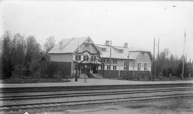 Tuurin asema koristeltuna Tampere-Vaasa radan 50-vuotisjuhlien kunniaksi. (1883-1933) Tuuri Valokuvaaja Heikki Heikkola