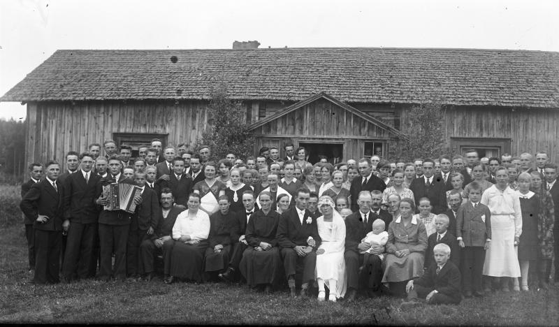 "Väinö Alasalmen ja Elma Rannanjärven häät, kuvattu Rannanjärven talon edessä. Vihitty 6.8.1932.
