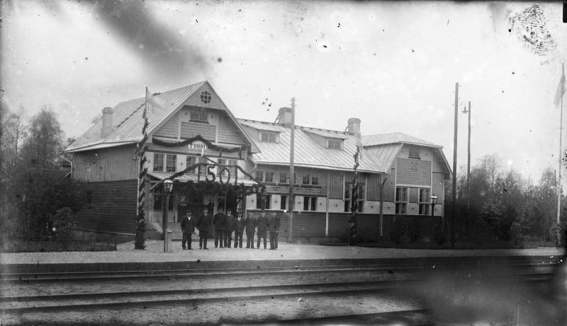 Tuurin asema koristeltuna v. 1933 Tampere-Vaasan radan 50-vuotisjuhlien kunniaksi. (1883-1933) Aseman henkilökunta kuvassa. Tuuri. Valokuvaaja Heikki Heikkola