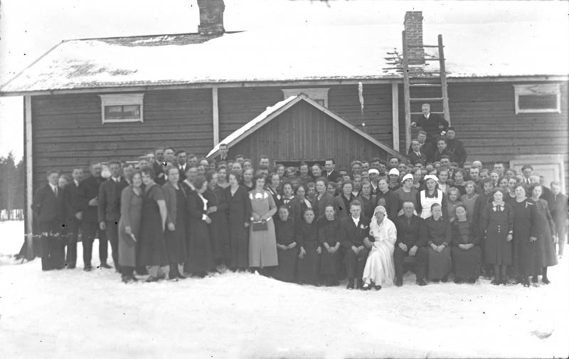 Hakojärvellä työväentalo. Helvi Yhtiö ja Konsta Keskiniemi, takana oviaukossa kesk. Elsa ja Heidi Lamminaho, Kaisa Lehtomäki, Väinö Saarimäki. Valokuvaaja Heikki Heikkola