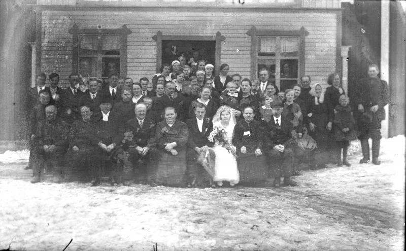 Eino Hautala ja Aino Kukkolan hääkuva 14.4.1935, morsiamen vieressä Lyydia ja Nestori Hautala, sulhasen vieressä Hilja ja Elias Kukkola. Valokuvaaja Heikki Heikkola