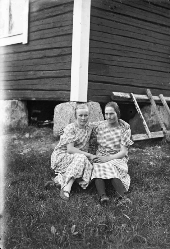 vas. Seidi Ylimäki os. Ahopelto ja Lyydia Ylimäki os. Taipalus. Rakennus takana raittiusyhdistyksen talo Hakojärvellä. Valokuvaaja Heikki Heikkola