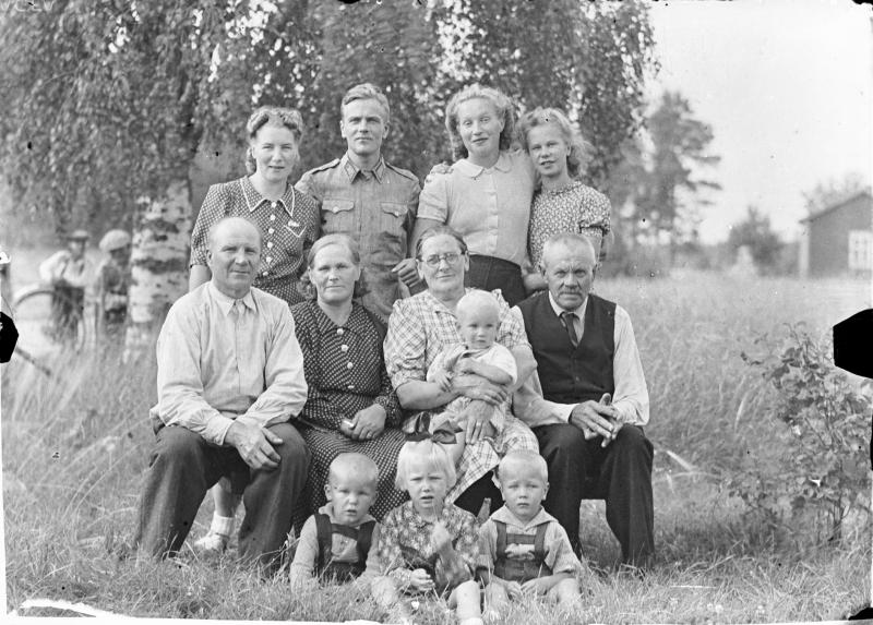 Takana vas. Aune ja Veikko Sarrivaara, Kerttu Ruuhela (myöh. Yli-Mutka), Vieno Hopea. Istumassa Rikhard ja Fanny Haaparanta, Hilma ja Konsta Hiipakka, Hilman sylissä Raimo Erkkilä. Edessä Jorma Haaparanta ja Saarnivaaran lapset, pojan nimi Kyrö