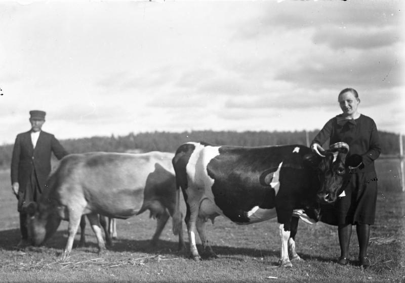 Juho Knuuttila, Helmi Hakomäki (tytär) os. Knuuttila. Lehmät Hertta ja Joulike. Valokuvaaja Heikki Heikkola