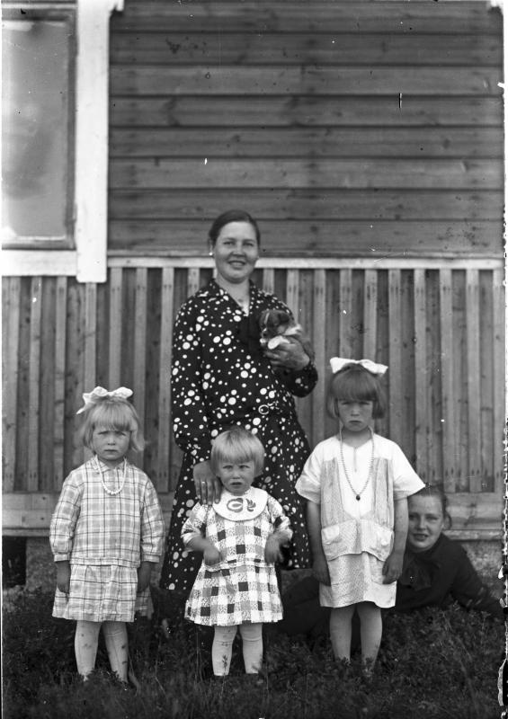 takana Esteri Ylä-Rautio ja Helmi Hakomäki. Sisarukset Laina, Eeva ja Lea Knuuttila. Valokuvaaja Heikki Heikkola