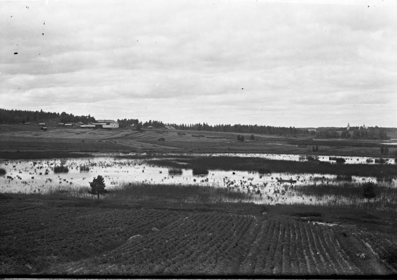 Kirkonkylä, Töysän kirkko näkyy oikealla. Vasemmalla Vuorenmaan ja Vuorelan talot. Valokuvaaja Heikki Heikkola