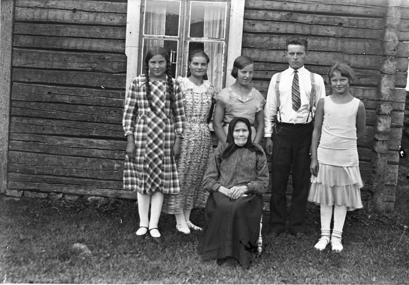 Edessä. Ida Lampila, Ida, Sylvi, Lea, Sulo, Ingeborg. Iida Lampila os. Korkeaniemi. Valokuvaaja Heikki Heikkola