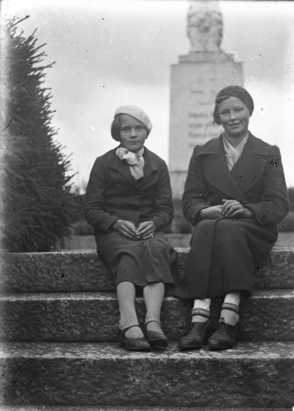 Vas. Elli Mäenniemi (myöh. Vaajamo), Saimi Uusitalo (os. Leinonen), Sankarihaudan portailla. Valokuvaaja Verner Vanhamäki