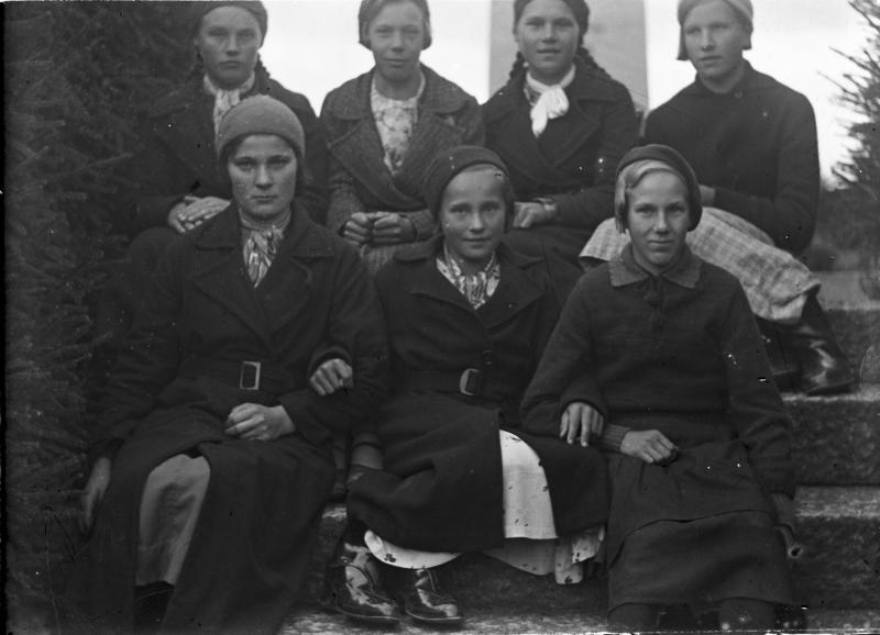 Takana oik. Eini Haaparanta, toinen oik. Eeva Liesmäki, alarivi vas. Kyllikki Mähönen? alarivi oik. Hilkka Korpi, Lampimäki?. Nämä ovat 1922 synt tai 1924 synt rippikoulutyttöjä. Kuvattu sankarihaudan portailla Valokuvaaja Verner Vanhamäki