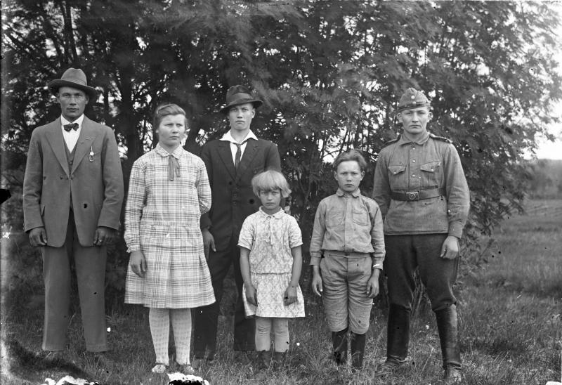 Holkon lapsia, vas. Eino Hakala, Tyyne Holkko myöh. Peltonen, Evert Holkko, Toini Holkko myöh. Hakala, Valter Holkko, Nestori Holkko Valokuvaaja Heikki Heikkola
