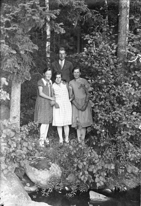 vas. Saima Mähönen nyk. Korhonen, Helga Flykt, oik. Esteri Koivisto os. Uusimäki, takana Myllyaho. Valokuvaaja Heikki Heikkola