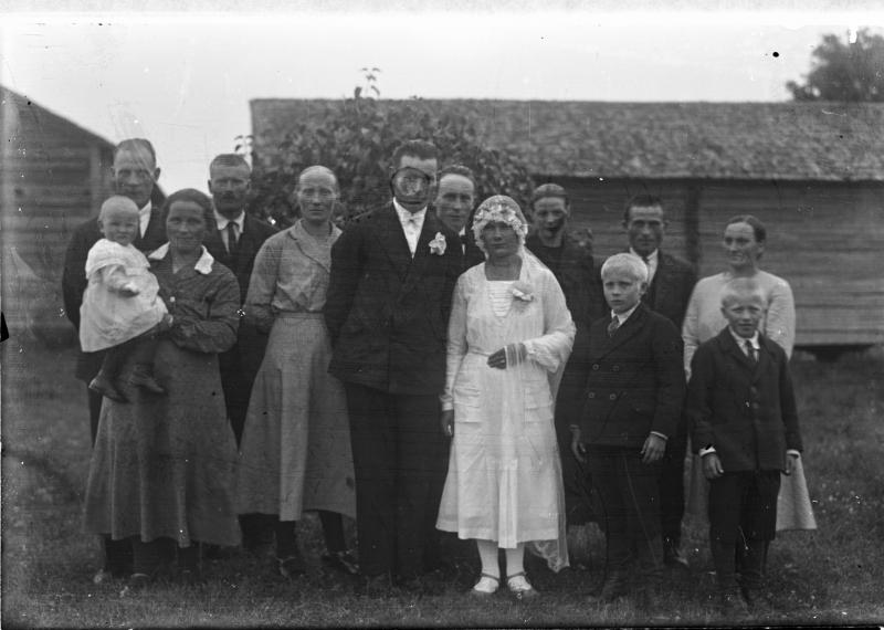 Elma Rannanjärvi ja Väinö Ala-Salmi häät 6.8.1932. Vas. Janne, Iida ja Eeva Ala-Salmi, Matti ja Maria Vähämäki, Reino ja Hellin Ala-Salmi, Matti ja Sanni Ilomäki, ja Vähämäen pojat Valokuvaaja Heikki Heikkola