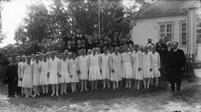 Oik edessä Tuomola, takana kanttori Mattila. 1914 synt. rippikoululaiset Takana pappilan rakennus Valokuvaaja Heikki Heikkola