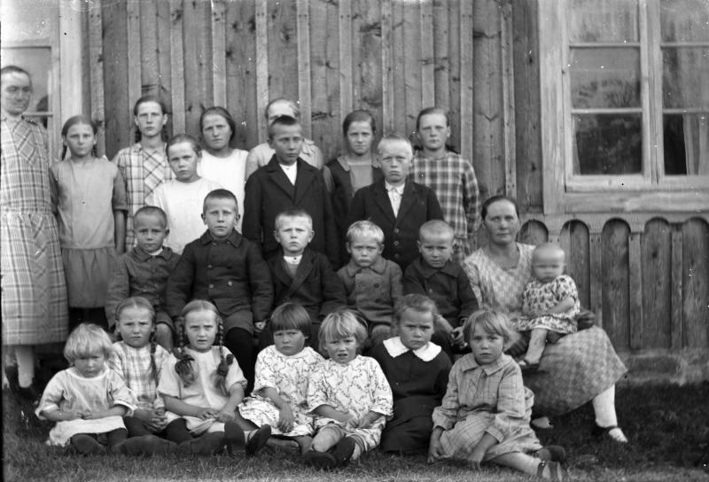 Eturivi vas. Aili Luoma, Esteri Luoma, Maria Palomäki, Esteri Liesmäki, Bertta Liesmäki, Eeva Liesmäki, Orvokki Palomäki. Toinen rivi vas, Arvo Liesmäki, Arvo Mäkelä, Aarne Luoma, Matti Liesmäki, Toivo Luoma, opettaja Maria Palomäki s. Mäkelä, sylissä Hilkka Mäkelä.