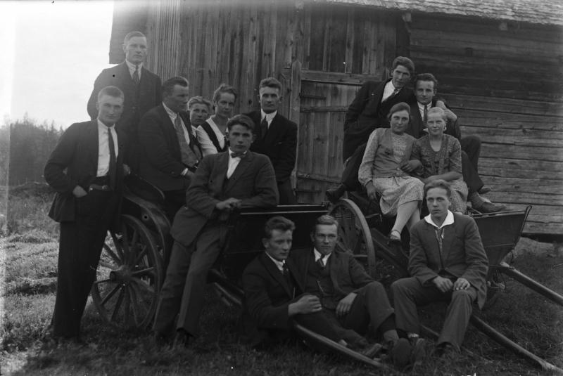 Edessä nojaa Eino Toivola, kärryillä Alli Jokiaho, Esteri Toivola, takana Aino Lahna, Kalle Jokiaho, Valde Toivola, Lauri Virtanen. Valokuvaaja Heikki Heikkola