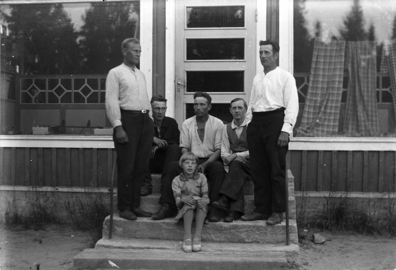 Oik. seisoo Vihtori Katajamäki, keskellä istuu Jussi Lamminaho, edessä myymälänhoitaja Vappulan tytär. Töysän aseman Osuuskauppa Hakojärvellä (löytyy kansiosta). Valokuvaaja Heikki Heikkola