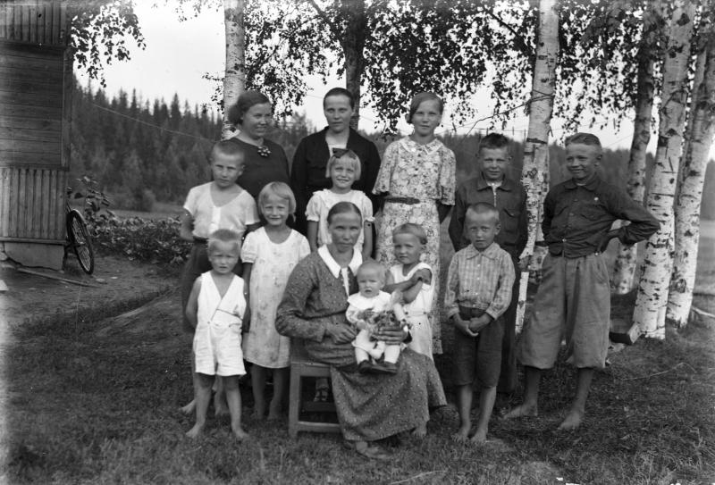Helka Pelander ja lapset tak. vas. Senja Kortesmäki, Tyyne Kortesmäki, Taimi, keskirivi vas. Olavi, Rauha, ?, Paavo Pelander (myöh. Pela), edessä Arvo, Aino, äiti Helga (os. Kortesmäki)sylissään Lilja, Aila ja Lauri. Valokuvaaja Heikki Heikkola