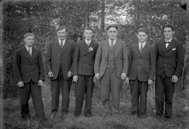 Eino Niemelä, Juho Mäenniemi, Arvo Savela, Elias Ylämäki, isä Savela ja Uuno Kaine. Valokuvaaja Heikki Heikkola