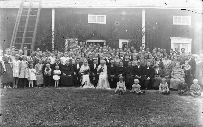 Kaksoishäät Töysän Mutkan talossa 4.7.1931. Hääparit: Unto Kangas, Rosa Mutka, Viljo Hautala ja Saima Mutka. Eturivissä istumassa oikealta 5:s Rovasti Väinö Tuomola ja 6:s ruustinna Laila Tuomola. Valokuvaaja Verner Vanhamäki
