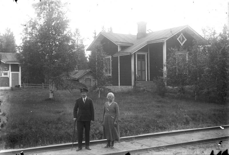 Ratavartija Riikonen puolisonsa kanssa. Vahtitupa taustalla, sijaitsi Töysän asemalta Tuuriin päin n. 2 km. Vahtitupa hajotettu. Valokuvaaja Heikki Heikkola