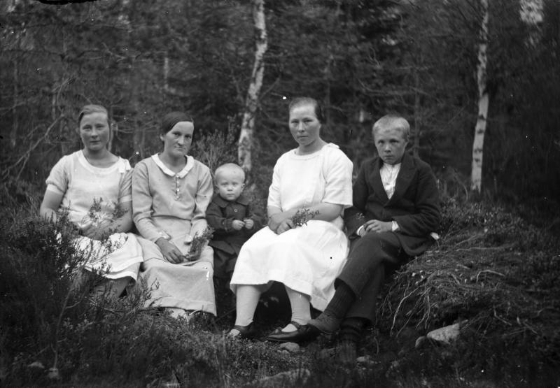 1. Vas. Impi Ilomäki (myöh. Peltomäki), 2. vas. Sanni Ilomäki (os. Ala-Salmi), Vilho Ilomäki Hilda Ilomäki (myöh. Pykälämäki) ja Onni Koskela. Valokuvaaja Verner Vanhamäki