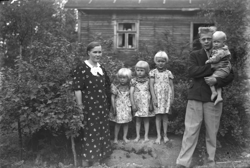 Lahtisen perhe. Hellä ja Olavi, vasen: Kerttu, Aino ja Anna-Liisa, Mauri sylissä. Valokuvaaja Heikki Heikkola