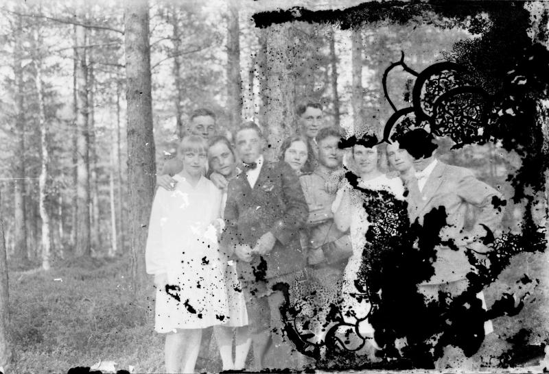Keskellä takana: Väinö Heikkola, Uuno Mähönen, toinen oik. Hilma Heikkola, Hilma Mäenpää (Urhon vaimo), Urho Mäenpää. Valokuvaaja Heikki Heikkola