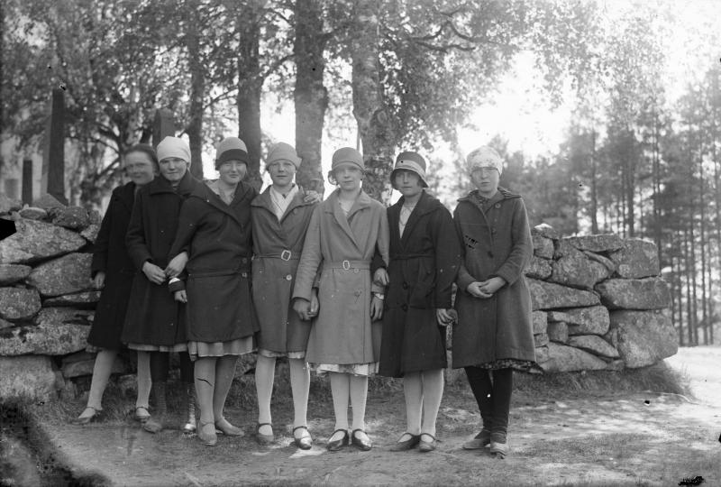Vuonna 1914-15 syntyneet rippikoulutytöt Töysän kirkon kiviaidan edessä. Toinen vas. Hilda Koskela, kolmas oik. Hilda Kyllikki Heikkilä myöh. Ylä-Mikkola, Peltonen. Valokuvaaja Heikki Heikkola