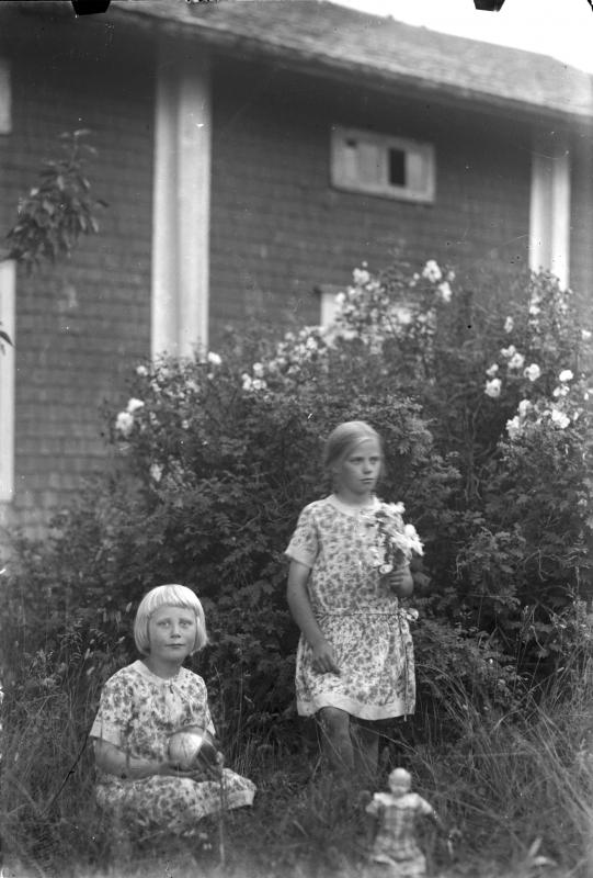 Vas istuu. Alma Edla Alina Koskimaa - Toivonen (syn. 10.6.1921. k. 28.12.1992. Turku, toimittaja) Oik. Lyyli Anna Maria Koskimaa - Heqenborth. Kirjailija Juho Koskimaan ja Fanny Ojanperän tyttäret. Talo oli Ryinkosken rannalla.