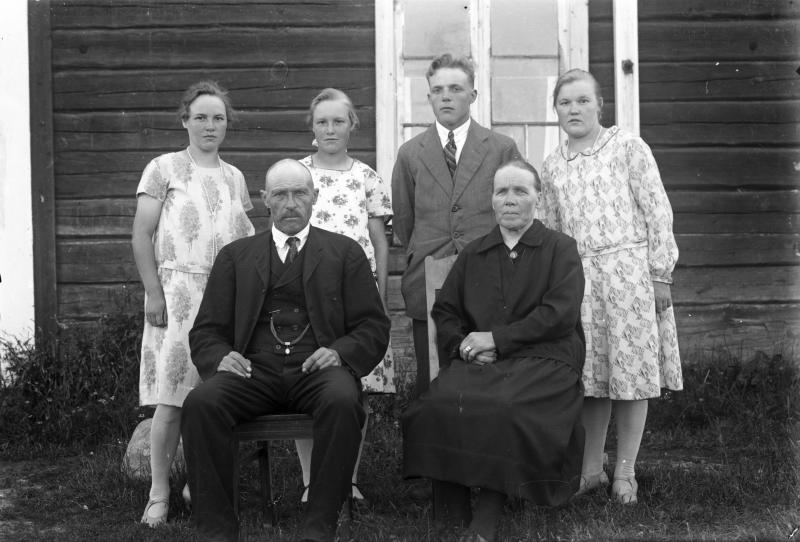 Koskenahon perhettä Töysän kirkonkylältä. Edessä Juho ja Hilma Koskenaho, takaa vas. Hilma (myöh. Housu), Vieno (myöh. Eteläaho), Lahja ja Helmi (myöh. Autio). Valokuvaaja Heikki Heikkola Kuvakoko 83x120