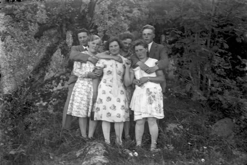 Lahja Koskenaho, Vilna Eteläaho (os Koskenaho), Eino, Ruusa Haveri, Aino Hietamäki (os Virtanen). Valokuvaaja Heikki Heikkola Kuvakoko 83x120