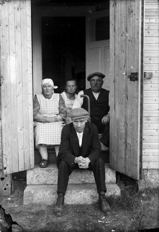 Selma, Toini ja Konsta (vanh) Tyrni. Toini myöh. Koskenaho. Edessä Eemeli Jalli. Valokuvaaja Heikki Heikkola