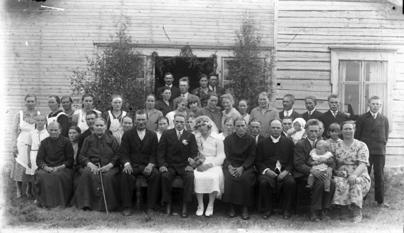 Aili Mesimäki, Aino ja Kuosti Kontoniemi, (Aino os. Valtee), vihitty 22.8.1931. Kolmas oik. rovasti Väinö Tuomola, alhaalla oikealla Tyyne ja Eino Kantoniemi.