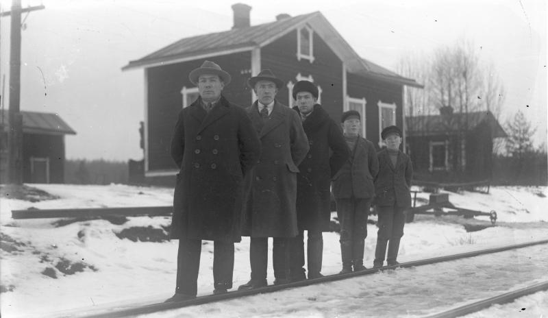 Jokelan veljekset edestä alkaen, Arvo, Artturi, Tauno, Alpo ja Paavo. Takana heidän kotinsa Töysän aseman vahtitupa, joka sijaitsi n. 4 km Töysän asemalta Ähtäriin päin. Valokuvaaja Heikki Heikkola