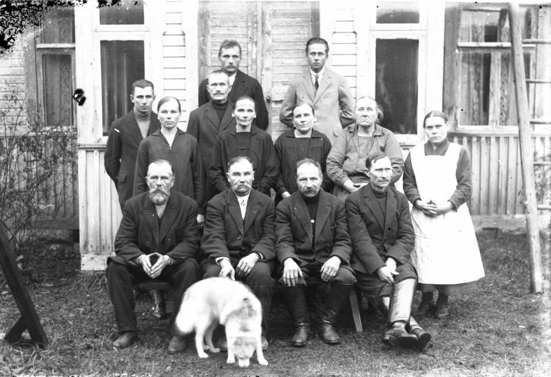 Takana vas. Matti Uusitalo ja Reino Vuorisalmi. Naisista 1. vas. Anna-Kaisa Holkko os. Vuorisalmi, vierellä Uuno Vuorisalmi. 2. Fanni Uusitalo os. Vuorisalmi. 3. Hilma Lanttola os. Vuorisalmi. 5. Ilmi Olkkonen. Istumassa oik. Heikki Lanttola, toinen vas. Nikolai Vuorisalmi. valokuvaaja Heikki Heikkola.