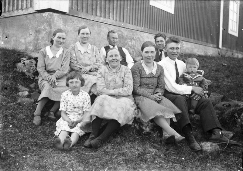 vas takana. Anna Hakojärvi, Vieno ja Erkki Kallioniemi, vas edessä Saima, Hilma, Lyyli ja Väinö Lanttola. Valokuvaaja Heikki Heikkola