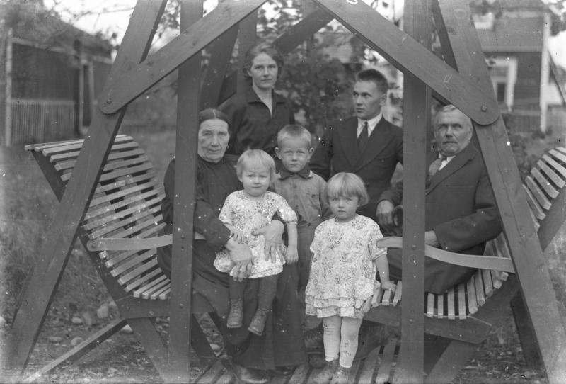 Lapset vas. Irja, Teuvo ja Aune Takala. Keskellä Liisa os. Huutoniemi ja Juho Takala. Takana Laimi ja Väinö Takala. Valokuvaaja Heikki Heikkola
