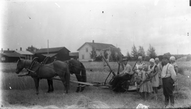 Iida Paavola toinen vasenmalta, Vihtori Paavolan väkeä elonleikkuussa 1930-luvun alussa. Vasemmalta Arvo Aho ajamassa, palvelija, Kaarina, Vihtori ja Hellin, tytöt edessä Eeva Kukkola, Hilkka Paavola o.s Pirttimäki. Seppo-koira
