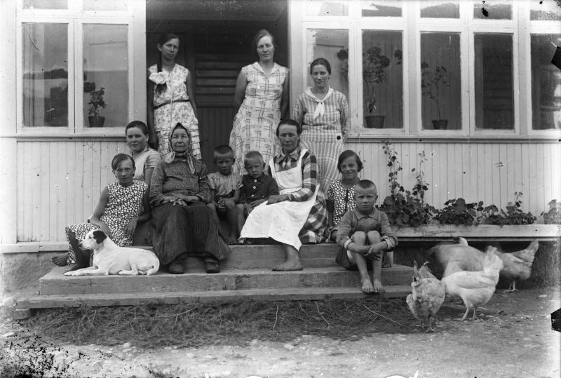 Takana. Hellin Paavola (Pirttimäki), Saima Aho, Aili Paavola. Edessä. Eeva Paavola (Kukkola), Anna Särkkä, (Iida Paavolan äiti), Mauno Paavola, Paavo Paavola, Iida Paavola, Hilkka Paavola, Eero Paavola. Valokuvaaja Heikki Heikkola