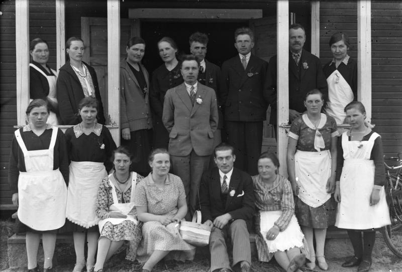 "Vas. takana: Iida Katajamäki, Elli Hakola, Mimmi Katajamäki, Hilma Saarimäki, Väinö Hakola, Eino Myllyaho, Konstu Hiipakka, Hilja Kuivasmäki. Keskellä: Vihtori Erkkilä. Eturivi seisomassa: Hilma Järvinen, Vieno Erkkilä, Helka Haapa-aho, Iida Saarimäki.