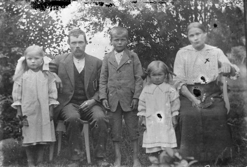 Vasemmalta: Kaino Ellen Elma Peurala myöh. Ojala, Heikki Vihtori Peurala, Reino Johannes Peurala, Kerttu Lyydi Annikki Peurala myöh. Heikkilä, Tonteri sekä Lyydi Heikintytär Peurala os. Yhtiö. Valokuvaaja Heikki Heikkola