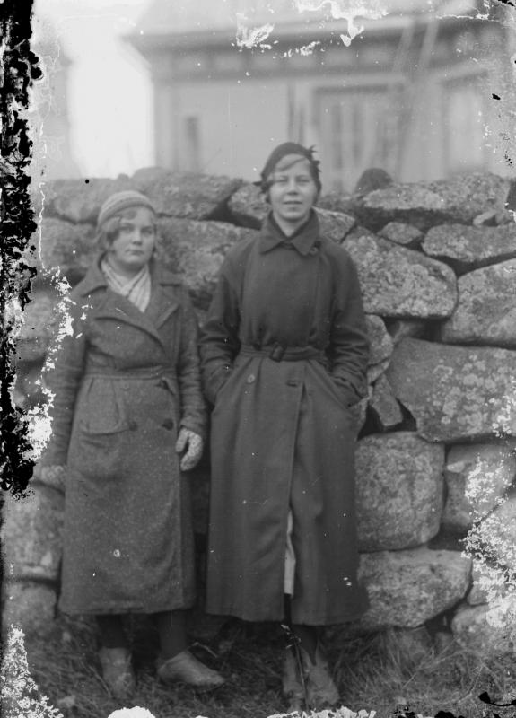 Naiset kirkon kivimuurin edessä, takana Töysän kirkko