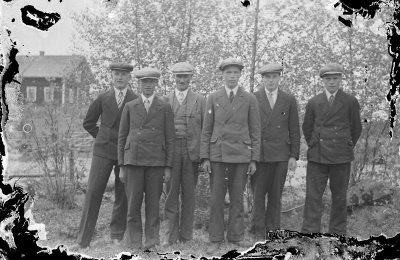 Vas. Eino Kukkola, kolmas vas. Jussi Kasari, toinen oik. Arvo Tohni. Takana Kukkolan talo. Valokuvaaja Heikki Heikkola